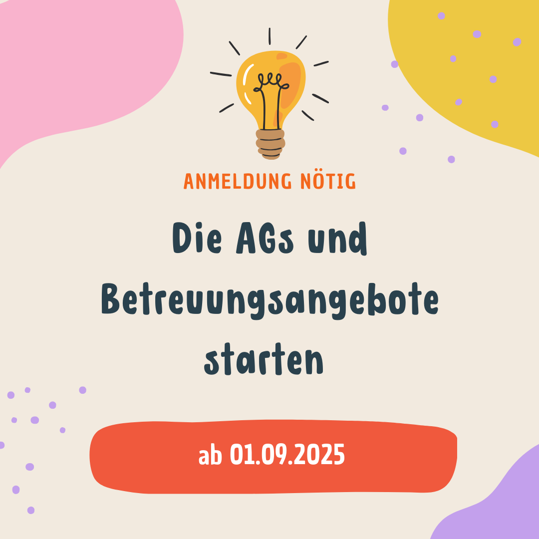 Wir freuen uns sehr, dass ab dem 01.09. unsere Arbeitsgemeinschaften und Betreuungsangebote beginnen!